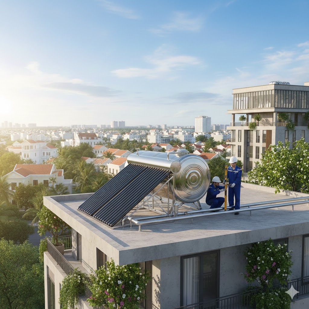 Về kết cấu mái nhà, bề mặt lắp đặt cần phải đủ chắc chắn để chịu được trọng lượng của bồn nước Inox chứa đầy nước (thường từ 150-300kg tùy dung tích). Nếu mái nhà yếu, cần gia cố thêm khung sắt hoặc kết cấu đỡ phù hợp. Khoảng cách từ máy nước nóng đến các điểm sử dụng như chậu rửa Inox hay vòi sen cũng cần được tính toán để đảm bảo áp lực nước ổn định.